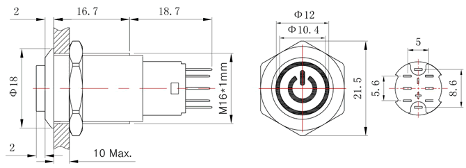 High round head. Momentary/Self-locking. Ring & power symbol light. J pin terminal