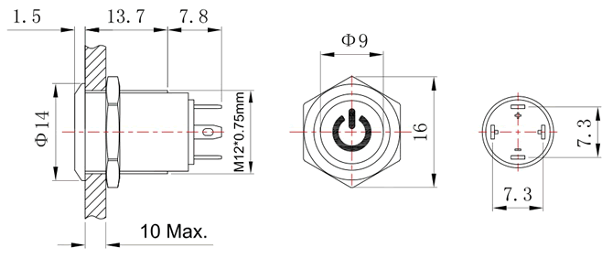 Flat head. Momentary. Power symbol light. J pin terminal